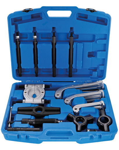 • 25 darabos, két- és háromkörmös, hidraulikus csapágylehúzó és csapágyszétválasztó készlet kék kofferben.