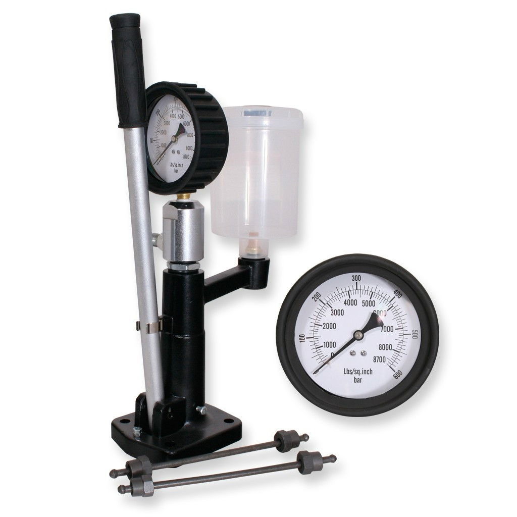 Diesel injektor (porlasztó) tesztelő és kalibráló kézi pumpa nyomásmérő órával, 0 - 600 barig skálázva.